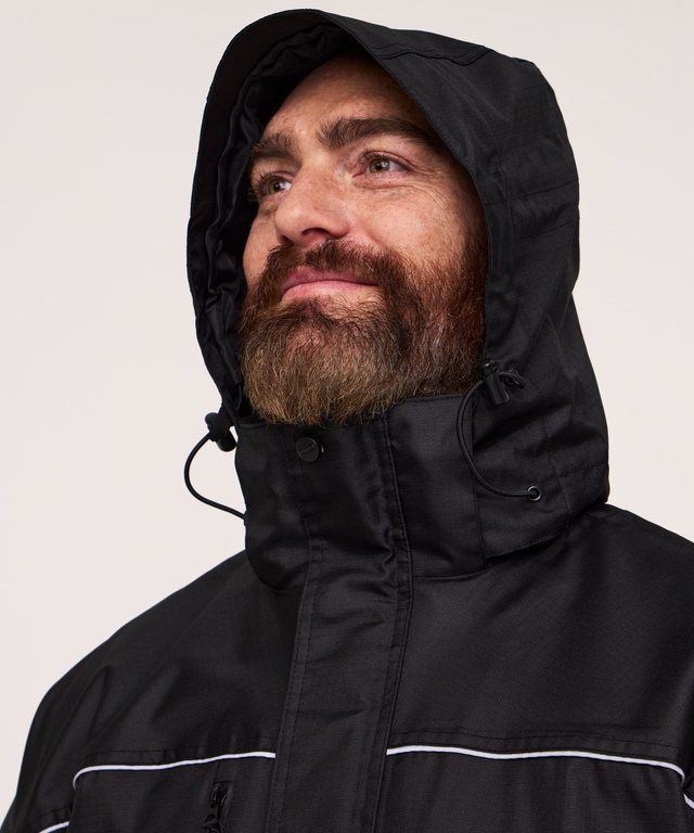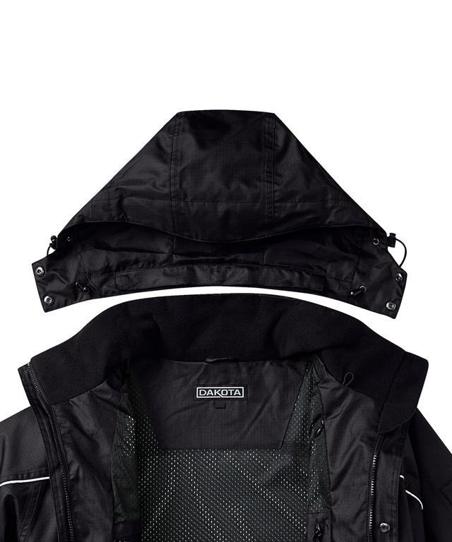 PROTECTION DE LA TÊTE ET DU COU: Capuche trois-pièces amovible avec fermeture à barillet réglable à l’arrière et cordon de serrage élastique. Boucle de fermeture à l’intérieur du cou, col et protège-menton doublés avec du molleton anti-boulochage pour plus de confort