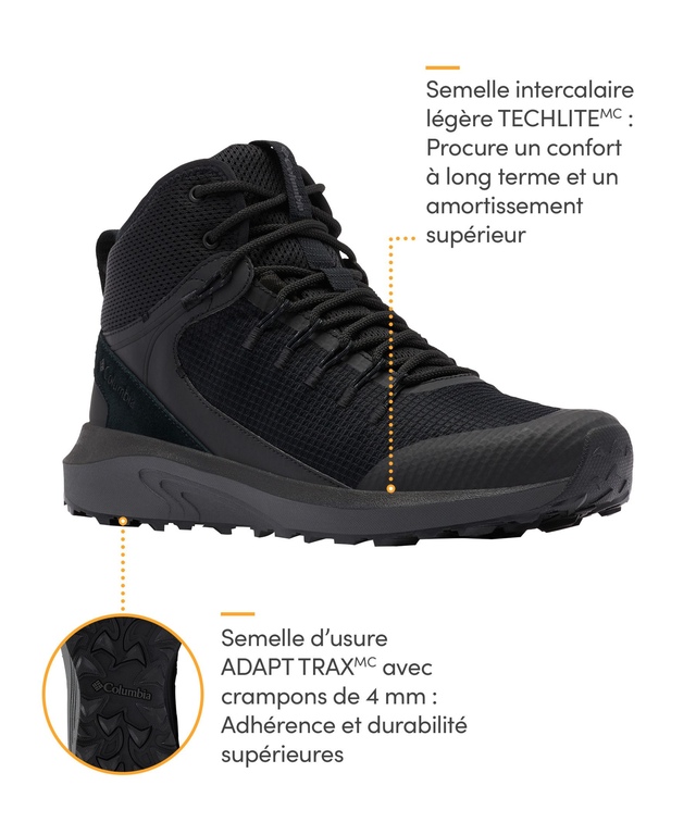 Conçues pour prendre d'assaut les sentiers, ces bottes Columbia vous aident à vous déplacer rapidement, à rester au sec et à vous sentir soutenu sur les terrains difficiles. Elles sont dotées d'une fabrication étanche à l'eau et perméable à l'air, d'une semelle intercalaire Techlite™ ultra-amortissante et d'une semelle d'usure Adapt Trax™ à adhérence exceptionnelle avec des crampons de 4 mm pour l'adhérence.