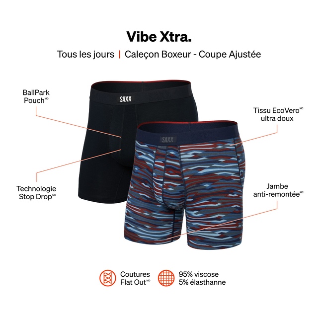 Le caleçon boxeur à coupe étroite Vibe Xtra de SAXX est l'un des produits les plus populaires de la marque pour de bonnes raisons. Il est fabriqué en tissu perméable à l'air qui évacue l'humidité. Par ailleurs, il est si doux que vous ne voudrez plus le retirer. En outre, le modèle Vibe est offert dans la plus vaste gamme d'imprimés de SAXX et intègre la technologie brevetée BallPark PouchMC.