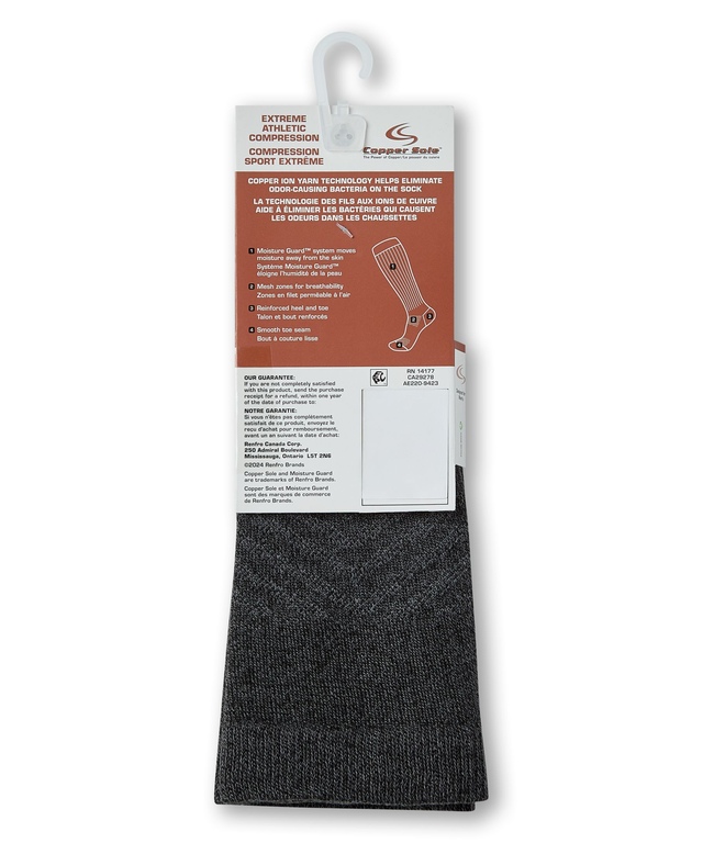 Des fils à ions de cuivre sont tissés dans ces chaussettes de compression sportives de Copper Sole. Ils éliminent naturellement les bactéries qui causent les odeurs et ils évacuent l'humidité. Ces chaussettes couvrent le mollet, supportent les muscles et améliorent la circulation sanguine.