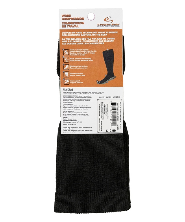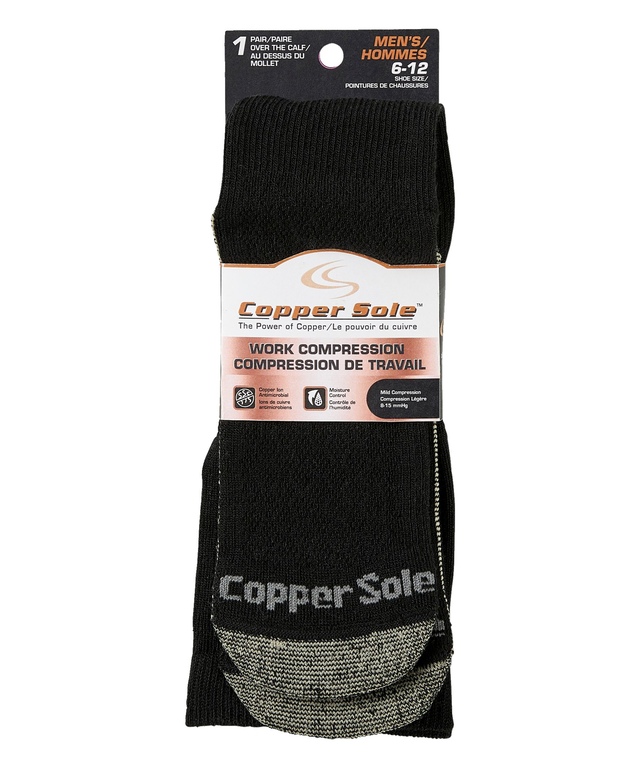 Ces chaussettes de compression sont tricotées à l'aide de la technologie d'ions de cuivre Copper Sole afin d'éliminer les bactéries et les moisissures. De plus, elles sont conçues pour favoriser la circulation sanguine. Par ailleurs, elles intègrent du Spandex pour un meilleur ajustement et sont munies d'un dessous rembourré pour un confort accru.