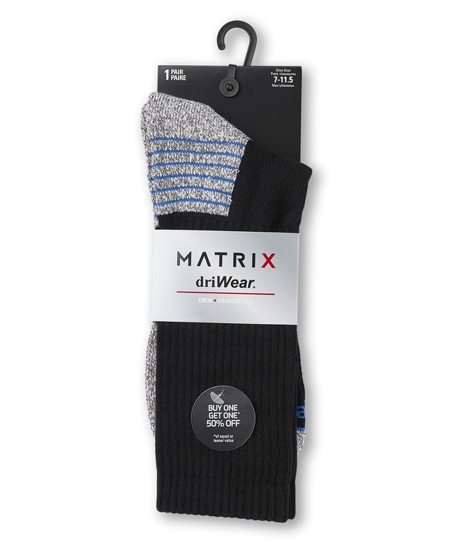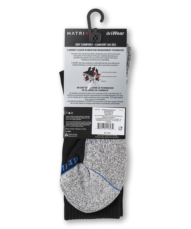Nos mi-chaussettes de sport de Matrix sont conçues pour être confortables lors des longues journées de travail. Elles sont munies d'une pointe sans coutures, d'un dessous rembourré et d'un soutien de voûte plantaire. De plus, ces chaussettes intègrent la technologie de contrôle avancé de l’humidité à sens unique DRIWEARMC avec X-ODOR pour vous garder au sec en toute fraicheur. Nous offrons ces chaussettes en une variété de couleurs et de motifs.