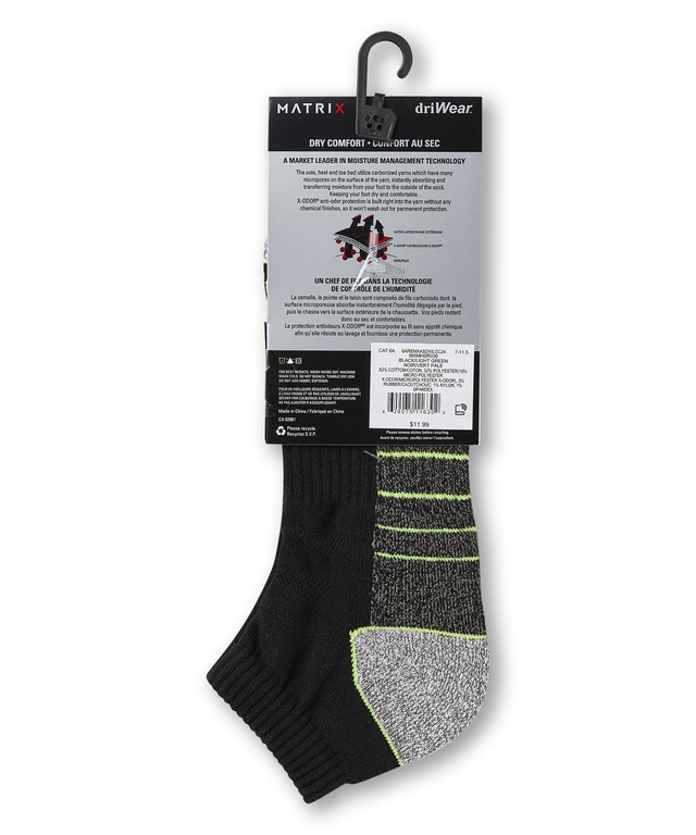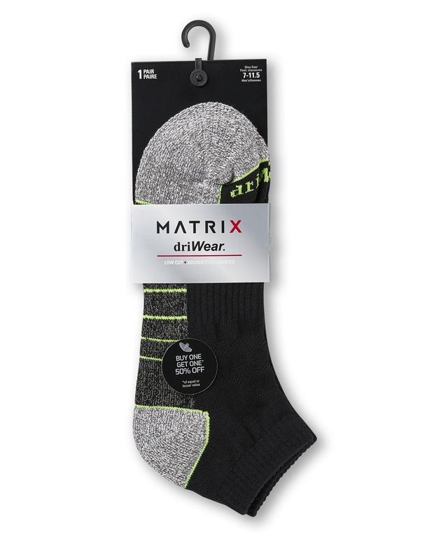 Nos chaussettes de sport basses de Matrix s'agenceront parfaitement à vos chaussures de course et à vos chaussures de sport. Elles sont munies d'une pointe sans coutures, de panneaux de soutien de voûte plantaire et d'une semelle rembourrée. Elles offrent donc un excellent confort aux hommes qui passent la majeure partie de la journée debout. De plus, ces chaussettes intègrent la technologie de contrôle avancé de l’humidité à sens unique DRIWEARMC avec X-ODOR pour vous garder au sec en toute fraicheur.