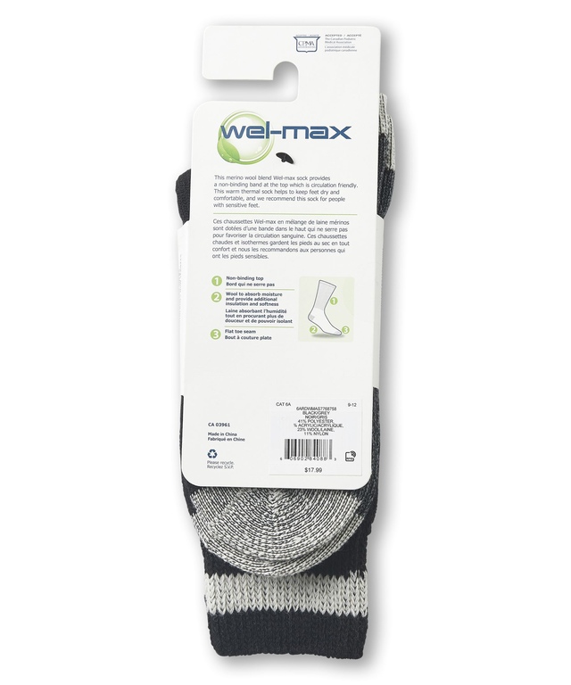 Ces chaussettes en mélange de laine mérinos de Wel-max sont munies d'une bande sans compression au haut qui favorise la circulation sanguine. De plus, ces chaussettes isothermes chaudes contribuent à garder les pieds au sec en tout confort. Elles sont recommandées pour les personnes qui ont les pieds sensibles.