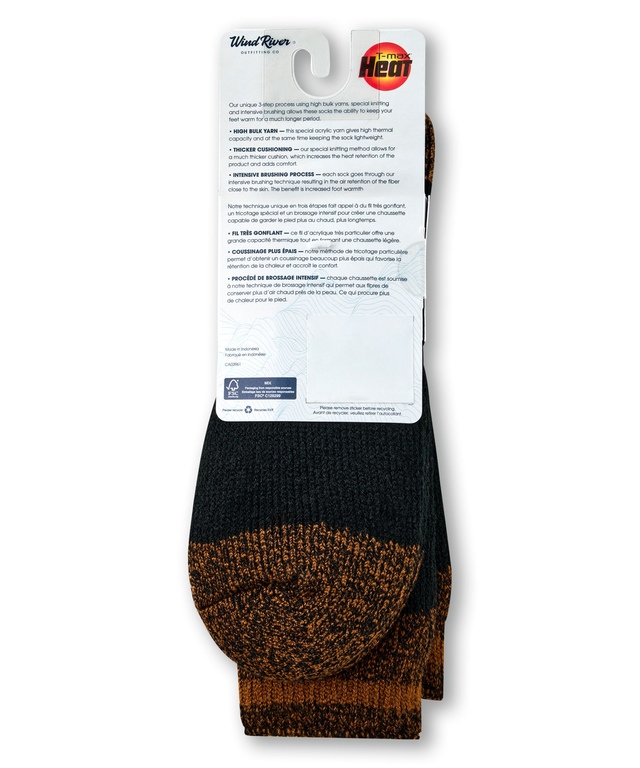 Grâce à la technologie T-MAX HEATMD, ces chaussettes de WindRiver sont parfaites pour être portées en hiver. Elle offre une rétention supérieure de la chaleur et une régulation de la température, Ces chaussettes sont douces et confortables grâce à la technique de brossage utilisée sur le fil qui donne du volume et emprisonne l'air chaud. Elles ont un talon et une pointe renforcés pour plus de durabilité.
