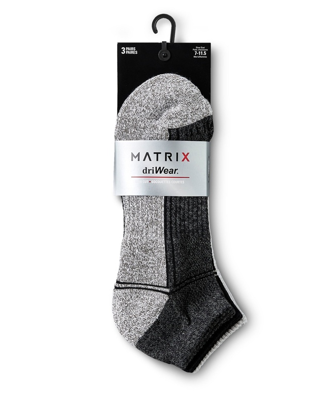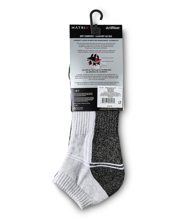 Ces chaussettes sport basses de Matrix sont dotées de notre traitement driWearMD avec X-ODOR qui garde vos pieds au sec et sans odeurs. Parmi les autres caractéristiques de confort, on trouve des dessus en filet pour la perméabilité à l’air, un soutien de voûte plantaire et des pointes sans coutures pour éviter l’irritation. Elles sont offertes en paquet de trois paires pour en simplifier l'achat.