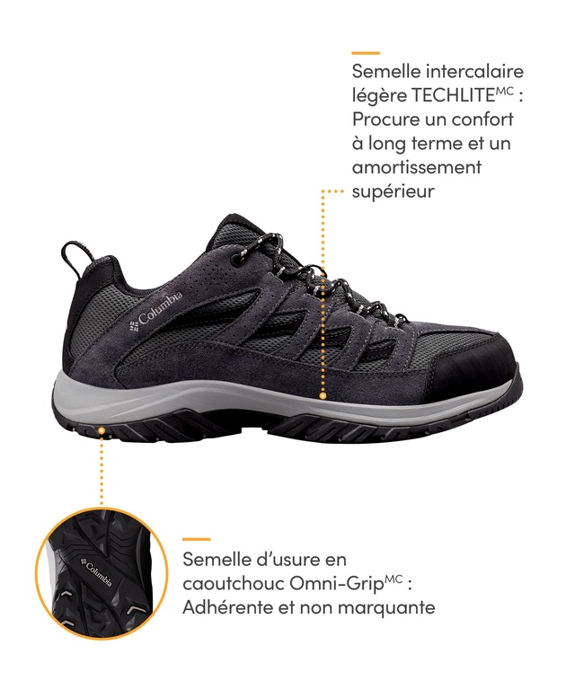 Cette chaussure de randonnée fiable Crestwood de Columbia gardera vos pieds au sec sur les sentiers. Ces chaussures de randonnée offrent un soutien en confort grâce aux semelles intercalaires TechLite™ et aux semelles d'usure adhérentes Omni-Grip™ en caoutchouc.