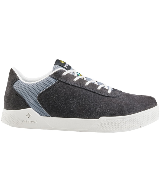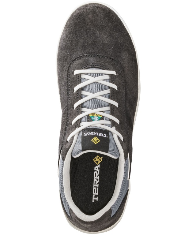 : Les chaussures de sécurité d'allure sportive Mullen de Terra possèdent un bout protecteur en aluminium et une semelle en composite conformes aux exigences de sécurité de catégorie 1 CSA. De plus, elles sont munies d'une tige en suède naturel ornée d'une petite bande en PET. Elles sont également dotées d'une semelle intérieure à haut rebond et d'une semelle d'usure monopièce de calibre industriel qui procurent confort et soutien tout au long de la journée de travail.
