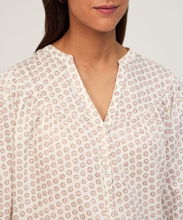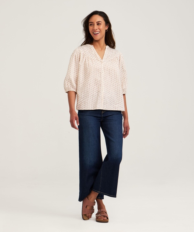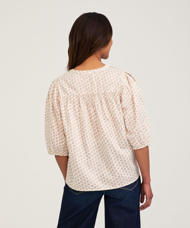 À la fois ample et confortable, ce chemisier de poète de Denver Hayes est fabriqué en coton lustré affichant un motif. Il possède des panneaux froncés sur le devant et à l'arrière offrant de l'espace pour plus de confort et d'aisance de mouvements. De plus, ce vêtement s'agence parfaitement à un jean ou à tout autre style de pantalon.
