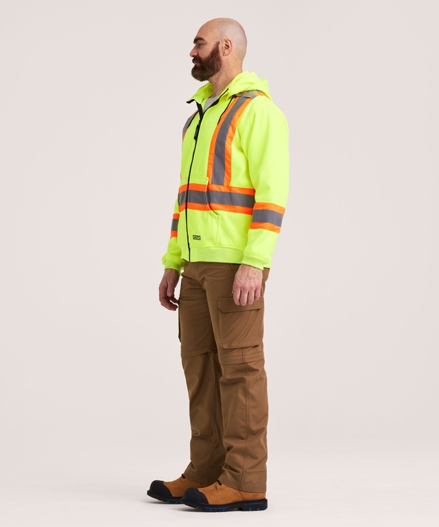 SÉCURITAIRE AVANT TOUT: Entièrement conforme aux normes : Catégorie 2, Niveau 2 CSA Z96-09 (devient Catégorie 3 CSA lorsque porté avec les bandes de jambes adéquates). Catégorie 2, Niveau 2 ANSI/ISEA 107-2010 . Matériau réfléchissant de 2 po (5 cm) en bande contrastante de 4 po (10 cm) est conforme à la configuration WCB/Worksafe/DOT.