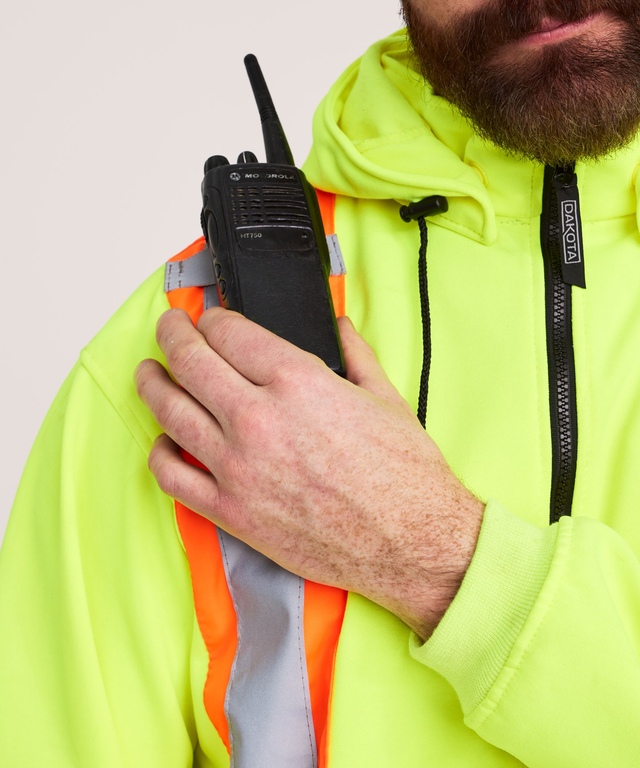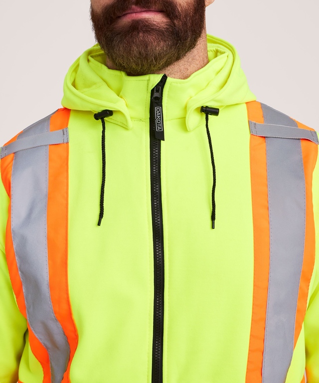 Confectionnée avec une double couche de molleton en tricot jersey, cette chaude veste à capuche est dotée d’une taille et de poignets de manches en tricot côtelé qui ne se déforment pas et vous protègent contre l’infiltration de l’air froid. Cette veste de Dakota est entièrement doublée de coton perméable à l’air. Le tissu de fond haute visibilité est rehaussé par des bandes réfléchissantes conformes aux normes de sécurité sur le devant, le dos et aux manches. Pour l’espace de rangement, la veste comprend des poches kangourou à l’avant, ainsi que des poches intérieures sécurisées par des fermetures à glissière.