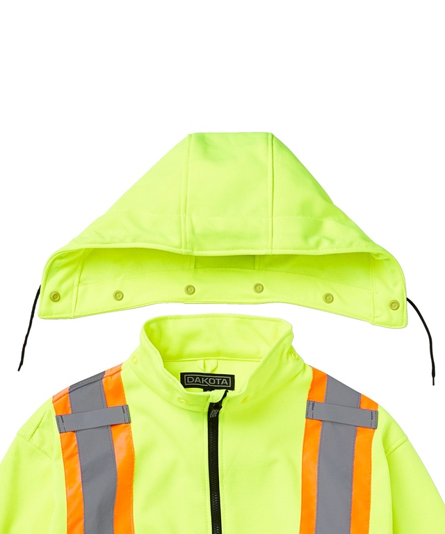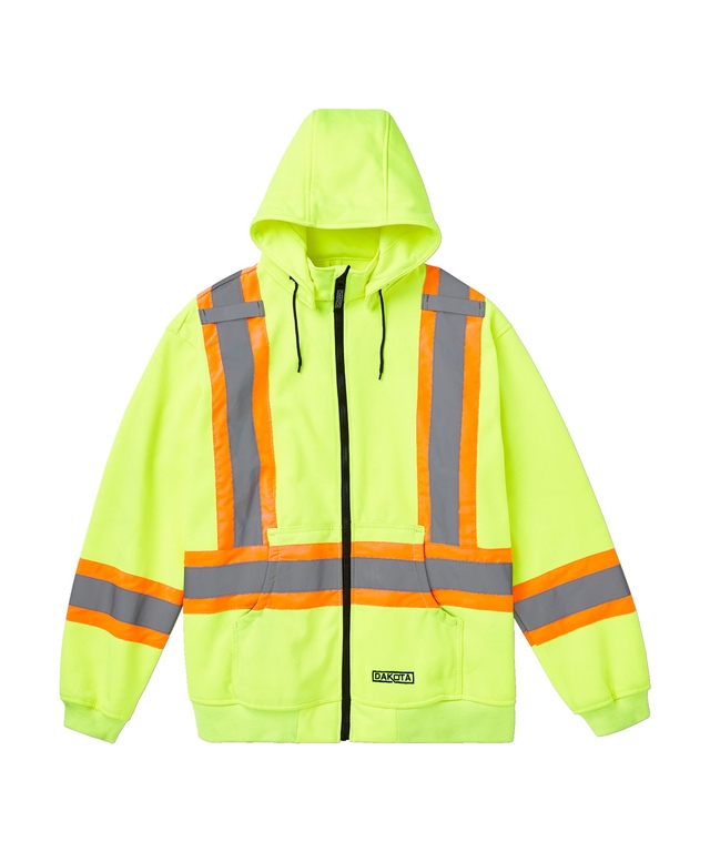 Confectionnée avec une double couche de molleton en tricot jersey, cette chaude veste à capuche est dotée d’une taille et de poignets de manches en tricot côtelé qui ne se déforment pas et vous protègent contre l’infiltration de l’air froid. Cette veste de Dakota est entièrement doublée de coton perméable à l’air. Le tissu de fond haute visibilité est rehaussé par des bandes réfléchissantes conformes aux normes de sécurité sur le devant, le dos et aux manches. Pour l’espace de rangement, la veste comprend des poches kangourou à l’avant, ainsi que des poches intérieures sécurisées par des fermetures à glissière.