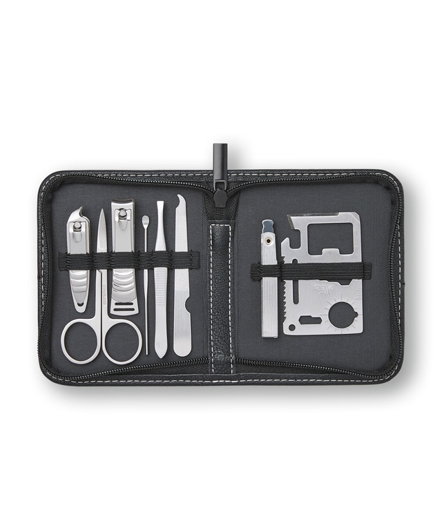 8 pièces : grande pince à ongles, petite pince à ongles, lime à ongles, pince à épiler, ciseaux, cure-oreille, repoussoir, outil pour carte de crédit.