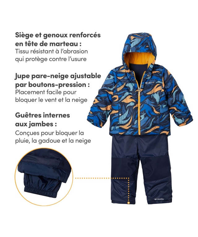 Cet ensemble veste et salopette miniature de performance est fabriqué en tissu imperméable. Elle intègre un isolant douillet pour garder les petits amateurs de neige au sec et bien au chaud. De plus, cet ensemble offre une foule de caractéristiques, comme une capuche doublée en molleton, des renforts au niveau du siège et des genoux ainsi qu'une taille pare-neige ajustable par boutons-pression. De plus, il est muni du système de croissance OutgrownMC de Columbia qui accompagnera la croissance de votre enfant au fil des saisons à venir.