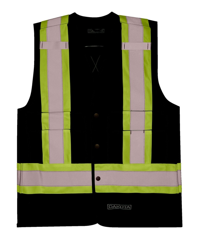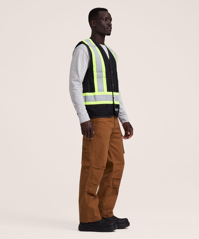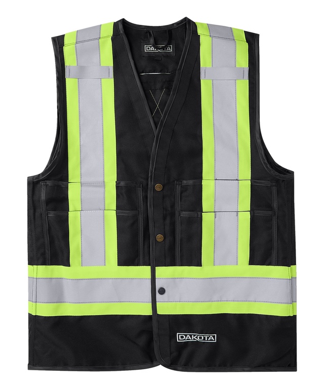 Ce gilet haute visibilité de Dakota est construit avec robustesse pour le port quotidien sur le chantier. Sa fabrication durable est dotée de renforcements aux points de tension; les coutures, et les bords de poches et du gilet sont bordés de tissu en polyester pour éviter l'abrasion et l'effilochage. Le gilet comprend des fentes latérales en filet pour empêcher la surchauffe et des goussets sur les côtés pour un ajustement extensible. Plusieurs poches et compartiments pour stylos et outils vous permettent de garder vos outils de travail à portée de la main. Ce gilet de sécurité est entièrement conforme aux normes pour vêtements à haute visibilité; il est parfait pour les travailleurs de construction, les travailleurs en entreposage, ainsi que pour les conducteurs de camion. Le mannequin mesure 6 pi 1-1/2 po (1,86 m) et porte ce gilet de sécurité en taille Grand.
