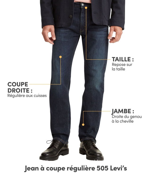 Le jean à coupe classique 505, doté de la braguette à fermeture à glissière originale créée en 1967, est l’un des modèles à jambe droite les plus populaires de Levi’s. Affichant un style classique à jambe droite aimé de tous, ce jean repose sur la taille et offre plus d’espace au niveau de la cuisse. Il est droit jusqu’à la cheville. La jambe droite est très polyvalente et convient à tous les types de silhouettes. Portez-le avec une chaussure de sport décontractée et repliez le bas. Doté de la Technologie + Cool : Tissus perméables à l'air et technologie évacuant l'humidité pour vous garder au frais. Style à l'américaine. De couleur noire, il vous permettra d'exprimer librement votre style.