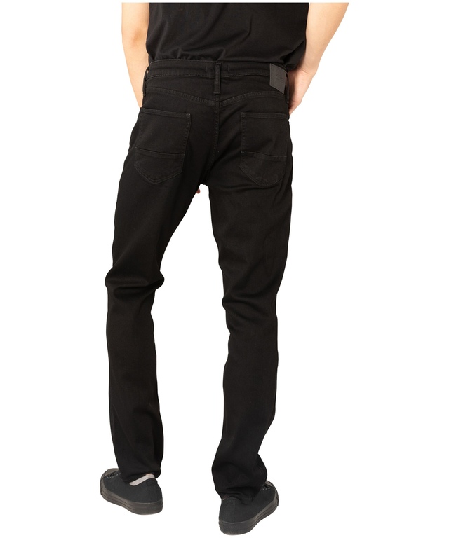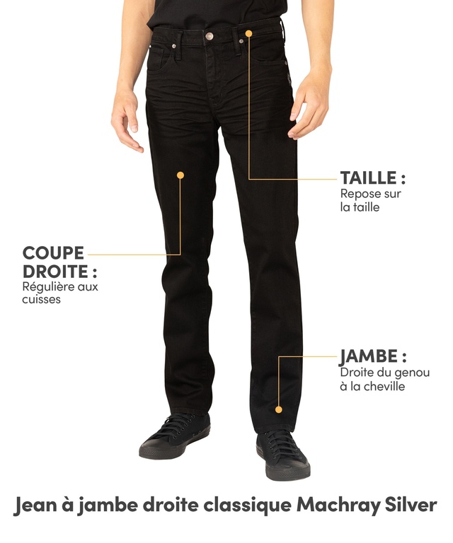 Ce jean à jambe droite de Silver Jeans affiche une teinte noire écologique grâce à un processus de délavage qui requiert moins d'eau et de produits chimiques. Ainsi, ce pantalon obtient un pointage écologique relativement à la mesure de l'impact environnemental (EIM) évalué et accrédité par JeanologiaMD.