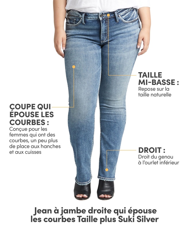 Le jean Suki qui épouse les courbes est le modèle à taille mi-basse le plus populaire de Silver Jeans. Il est conçu avec une ceinture qui épouse les contours là où vous en avez besoin pour éviter le bâillement. Il est aussi flatteur pour les courbes arrière plus généreuses et il a des poches arrière qui créent un effet rehausse-fesses. Ce jean offre plus d'aisance aux hanches et aux cuisses tout en moulant vos courbes.