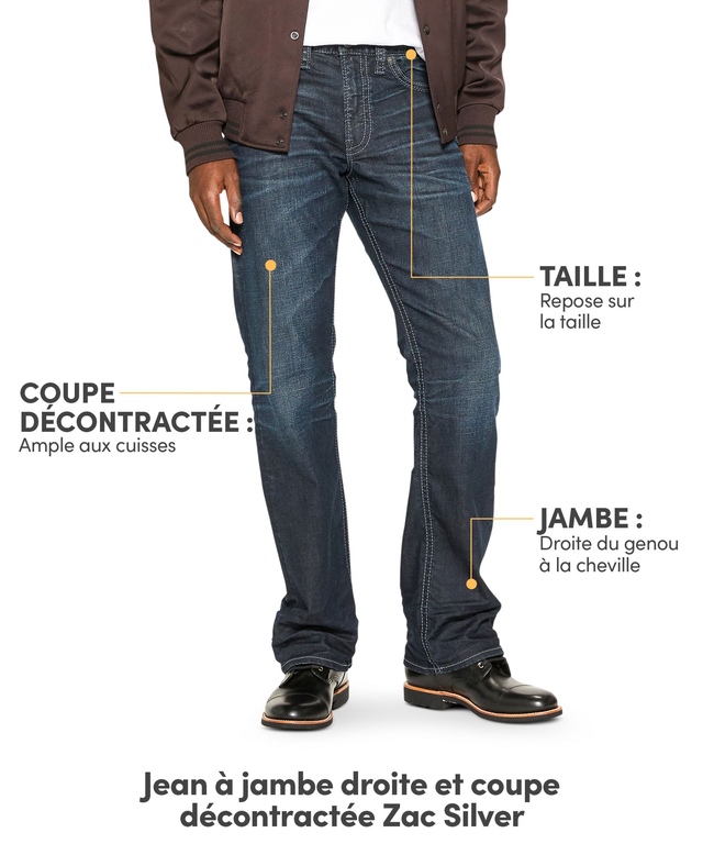 Le jean Zac de Silver Jeans est à la fois décontracté et facile à porter. Il repose légèrement sous la taille et arbore une coupe décontractée aux cuisses et aux hanches. Son tissu légèrement extensible est conçu pour offrir plus de confort. Ce jean arbore un délavé indigo foncé avec motifs subtils de ponçage et de moustache. Ce modèle affiche une jambe droite classique ainsi que les coutures en s de la marque sur les poches arrière.