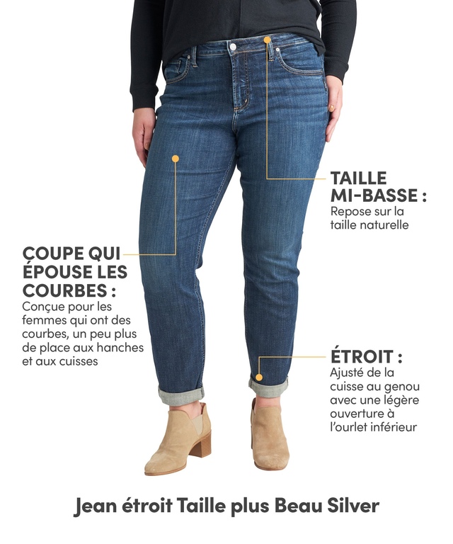 Le Beau à taille mi-basse et à jambe étroite de taille plus est une version plus étroite de l’incontournable Not Your Boyfriend's Jeans. Il offre la coupe girlfriend dont vous avez besoin. Sa taille mi-basse convient parfaitement à vos tenues de tous les jours. De plus, la coupe est légèrement décontractée le long de la hanche et de la cuisse pour vous procurer juste ce qu’il faut de confort. On vous conseille de commander une taille plus petite pour un ajustement plus serré.