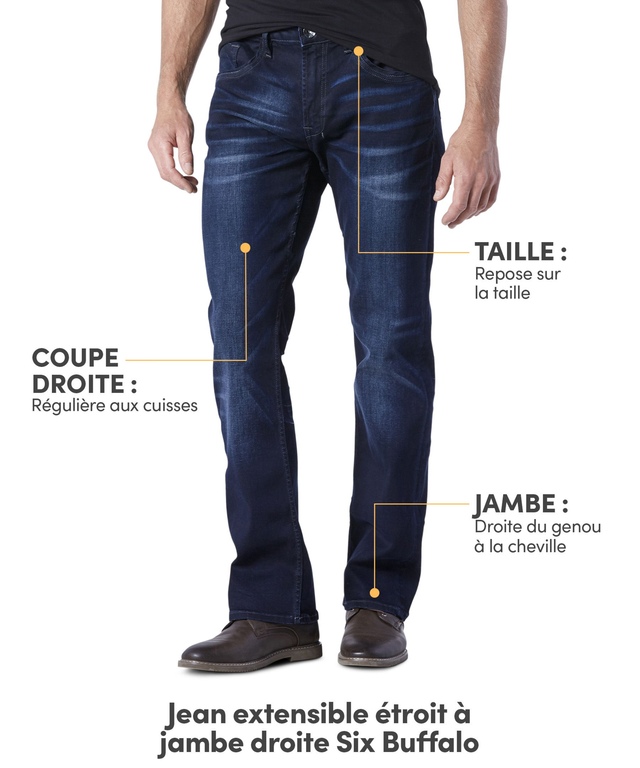 Ce jean délavé foncé Six de Buffalo arbore un fini naturellement délavé avec effet de moustache qui lui confère un look doux et un style «déjà porté» dès le départ. La coupe étroite et droite lui donne un aspect résolument moderne. Ce jean pour hommes est fabriqué en mélange de lyocell robuste avec un soupçon d'extensibilité pour un confort exceptionnel. Il a également les caractéristiques typiques d'un jean: des passants de ceinture, une braguette à fermeture à glissière et cinq poches.