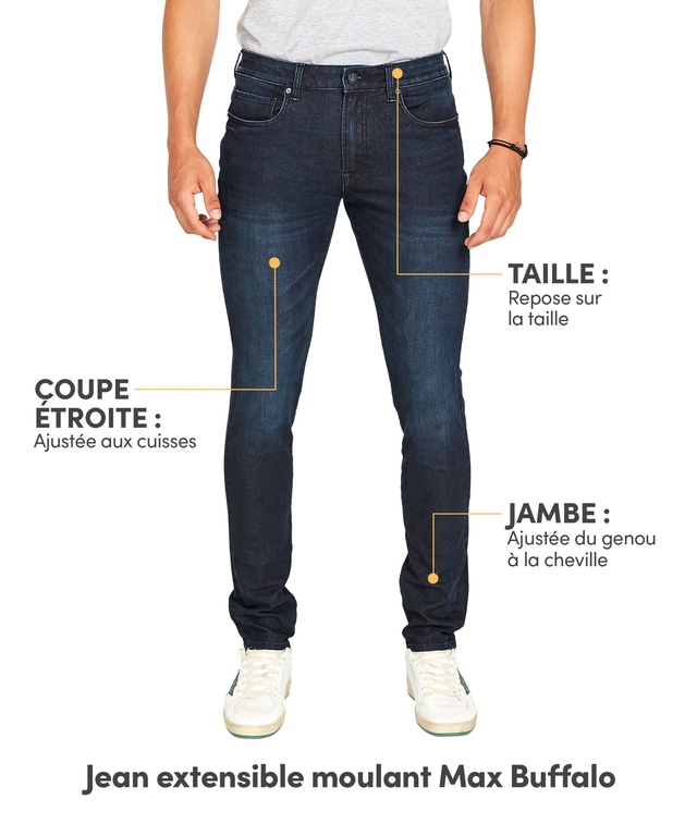 Le jean moulant classique de Buffalo dans un délavé bleu marine écologique. Taille basse. Ajusté à la jambe et confortable aux hanches. Style classique à cinq poches. Fait d'un denim extensible confortable et durable. Ponçage et décoloration à la jambe. Écusson à logo écologique caractéristique de la marque sur la ceinture arrière.