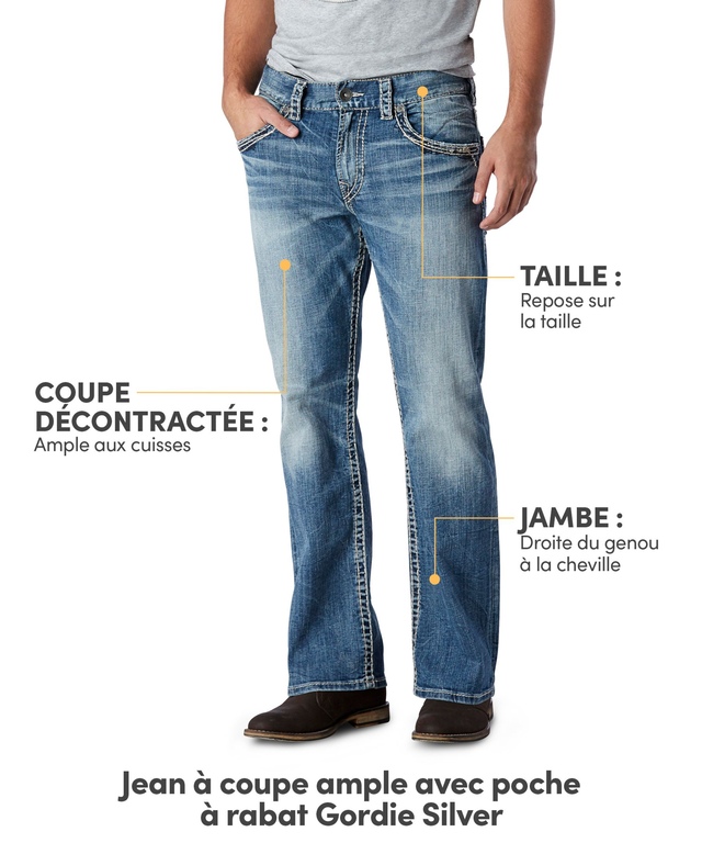 Le jean Gordie de Silver a une coupe ample. Il comprend une coupe très ample au niveau de la cuisse avec un tour de jambe droit classique. Il est aussi extrêmement confortable grâce au denim de la marque révolutionnaire EMC : Endurance. Mobilité. Classique. Après avoir rigoureusement testé le denim pour ses excellentes qualités, Silver a mis au point un savant mélange offrant une durabilité maximale, une flexibilité performante et un look d'apparence brute. Le délavé foncé met en évidence l’effet de sablage à la main et l'effet déchiré qui confèrent à ce jean un style unique. Les poches arrière ont une couture classique avec un aspect usé d’inspiration rétro.
