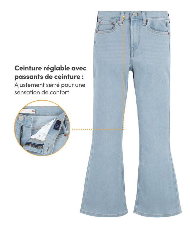 Voici le plus récent ajout du populaire «Lot 700» - le jean évasé à taille haute 726MC de Levi'sMD. Grâce à sa taille haute indémodable, il est le compagnon parfait pour les t-shirts et les chandails à capuche courts. Sa jambe évasée lui donne une silhouette unique. Il est confectionné de denim durable avec davantage d'extensibilité et il est doté d'une ceinture réglable pour une coupe ajustée et plus de confort pour accommoder la croissance.