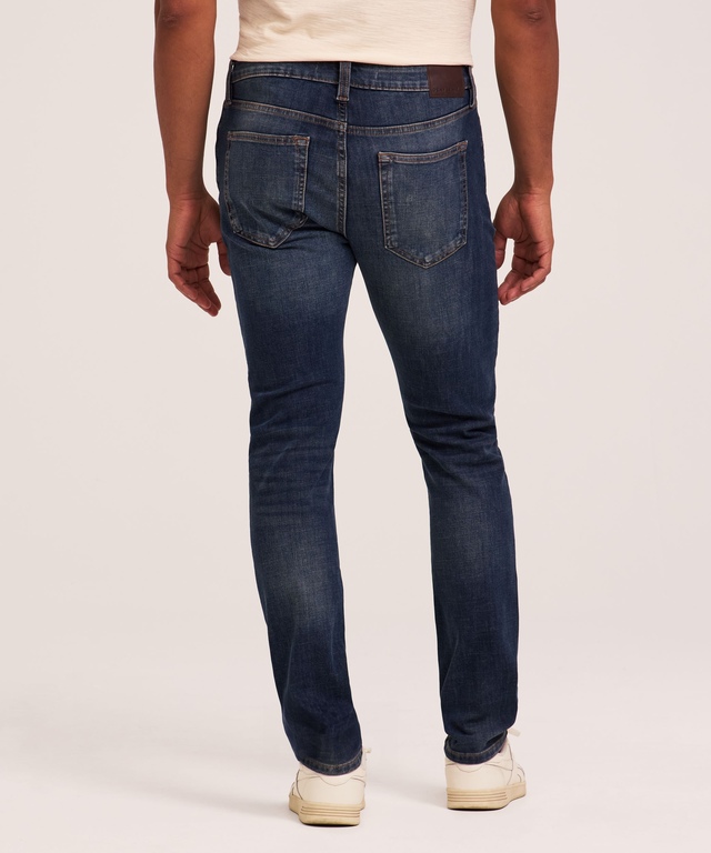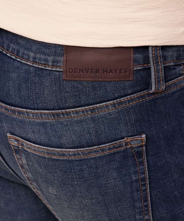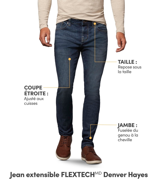 Ces jeans Denver Hayes à coupe étroite sont fabriqués avec du tissu spécialisé FLEXTECH® de forme robuste, offrant d'excellent extensibilité. Ils comprennent toutes les caractéristiques standards des jeans que vous préférez et sont disponibles en délavé foncé avec décoloration légère et effet de moustaches. Liam mesure 6 pi 1 po et il porte des jeans avec bande de taille de 34 po.