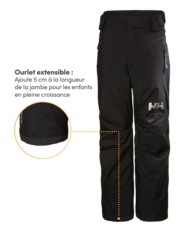 Le pantalon de ski ajusté unisexe à coupe classique de Helly Hansen a une touche de couleur dans les détails. Le pantalon entièrement étanche à l'eau présente une longueur de jambe extensible pour durer plus longtemps. Il est articulé pour donner aux enfants une mobilité accrue. La guêtre de botte imperméable est dotée d'un élastique de préhension et d'un crochet de botte pour fixer le pantalon à leurs bottes de ski.