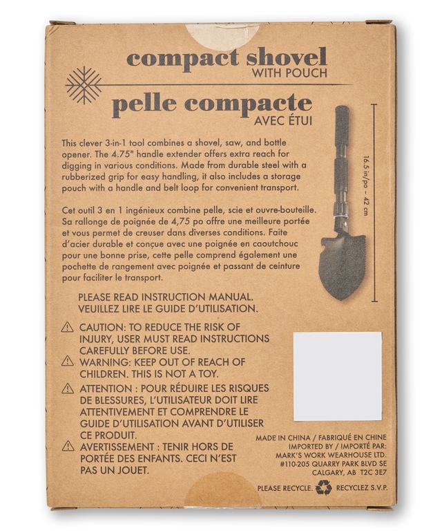 Cette pelle compacte polyvalente propose une conception trois-en-un : elle sert de pelle, de scie et de décapsuleur, le tout dans la paume de la main. Cet outil multifonctions à triple usage est en acier robuste de haute qualité. Il est conçu pour les tâches difficiles, que ce soit de déloger la voiture de la boue, du sable ou de la neige, ou de débroussailler votre terrain de camping.
