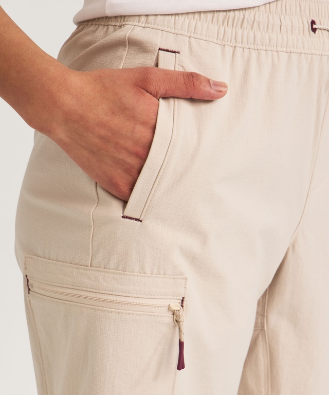 Espace de rangement : Poches latérales passepoilées sur le devant. Poches cargo à fermeture à glissière. Poche arrière unique à fermeture à glissière. Anneau en D du côté gauche arrière de la taille