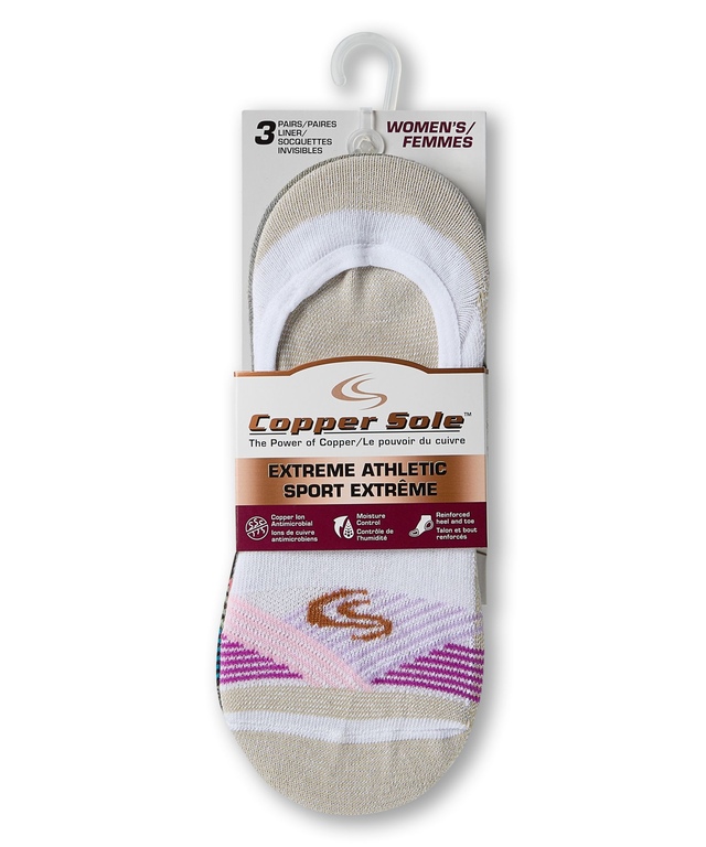 Ces socquettes Extreme Athletic de Copper Sole pour femmes sont dotées d'une technologie d'ions de cuivre pour éliminer naturellement les bactéries et d'un système Moisture GuardMC qui éloigne l'humidité de la peau. Ces chaussettes offrent un confort accru grâce à un talon et une pointe renforcés pour plus de durabilité, et à une couture plate aux orteils pour empêcher l'irritation. Elles sont offertes en paquet de trois paires pour faciliter les achats.