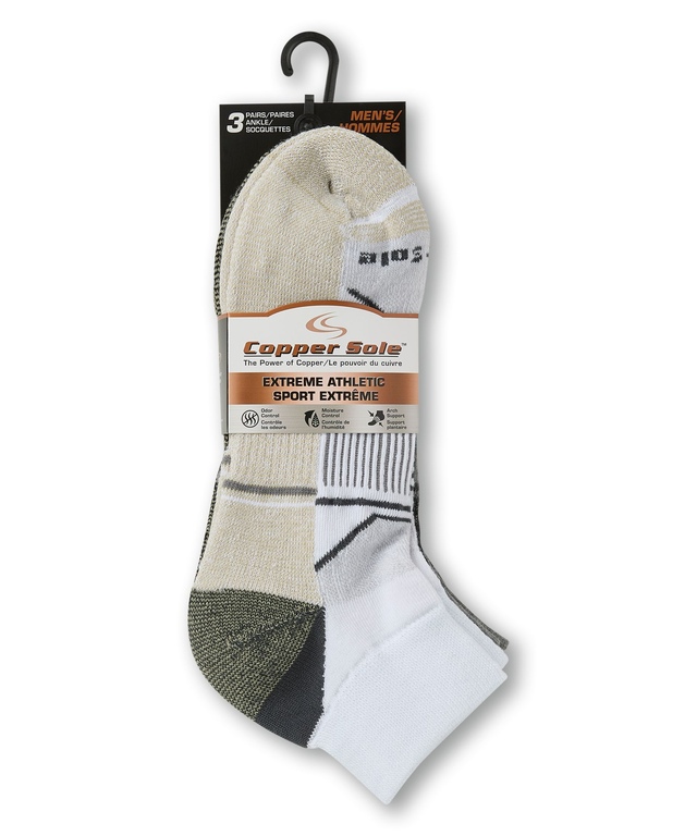 Les socquettes sport Extreme pour hommes de Copper Sole sont dotées du Système Moisture GuardMC qui éloigne l'humidité de la peau. Ces chaussettes pour hommes offrent un soutien de voûte plantaire et des sections en filet pour une perméabilité à l’air. Elles ont de plus un talon et une pointe renforcés de même qu'un dessous rembourré pour une protection digne des athlètes et un confort optimal.