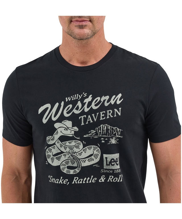 Visitez la taverne western chez Willey avec ce t-shirt avec graphique de serpent à sonnettes. Ce t-shirt est fait de coton à fil de continu à anneaux doux et perméable à l'air avec un fini délavé doux pour plus de confort.