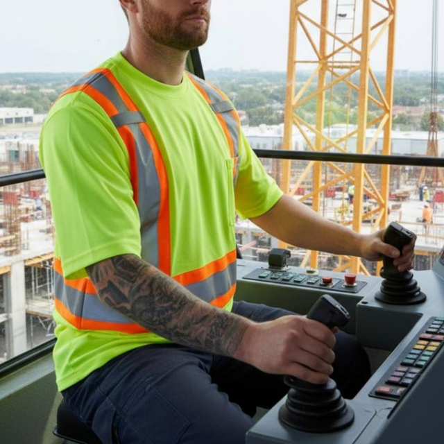 Ce t-shirt de travail haute visibilité à manches courtes de Dakota convient parfaitement aux travailleurs qui œuvrent sur les chantiers de construction extérieurs, aux camionneurs ainsi qu'au personnel d'entrepôt. Il est fabriqué en tissu double épaisseur et arbore un extérieur en polyester résistant grand teint de première qualité. En outre, il possède un intérieur en coton doux et perméable à l'air. Ce t-shirt de sécurité est conforme aux normes canadiennes applicables en matière de visibilité. Il affiche ainsi des bandes réfléchissantes au corps et sur les manches. Les rayures sur la poitrine comportent des endroits qui vous permettront d'accrocher un insigne d'identité, un téléphone cellulaire ou un appareil radio. Christopher mesure 1,90 m (6 pi 3 po) et porte ce t-shirt de sécurité en taille Grand