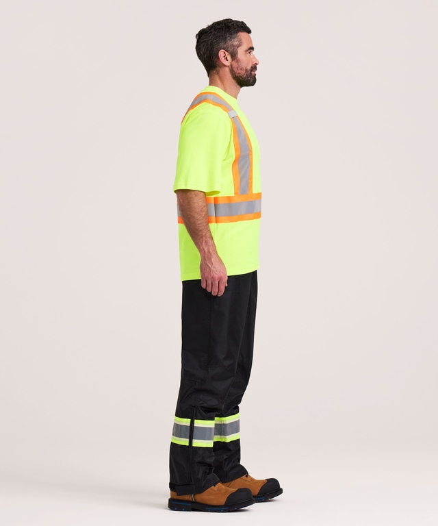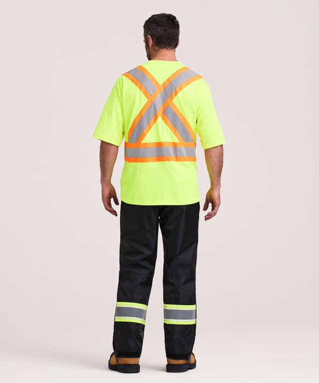Ce t-shirt de travail haute visibilité à manches courtes de Dakota convient parfaitement aux travailleurs qui œuvrent sur les chantiers de construction extérieurs, aux camionneurs ainsi qu'au personnel d'entrepôt. Il est fabriqué en tissu double épaisseur et arbore un extérieur en polyester résistant grand teint de première qualité. En outre, il possède un intérieur en coton doux et perméable à l'air. Ce t-shirt de sécurité est conforme aux normes canadiennes applicables en matière de visibilité. Il affiche ainsi des bandes réfléchissantes au corps et sur les manches. Les rayures sur la poitrine comportent des endroits qui vous permettront d'accrocher un insigne d'identité, un téléphone cellulaire ou un appareil radio. Christopher mesure 1,90 m (6 pi 3 po) et porte ce t-shirt de sécurité en taille Grand