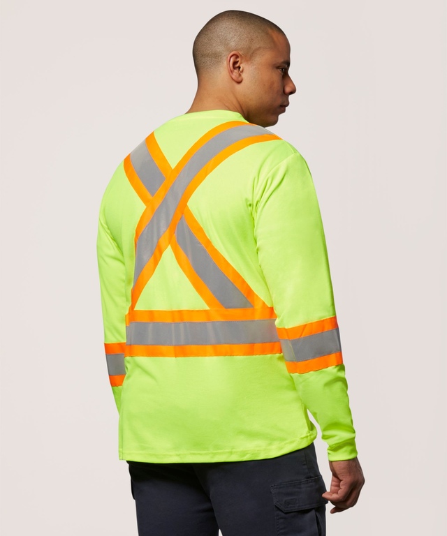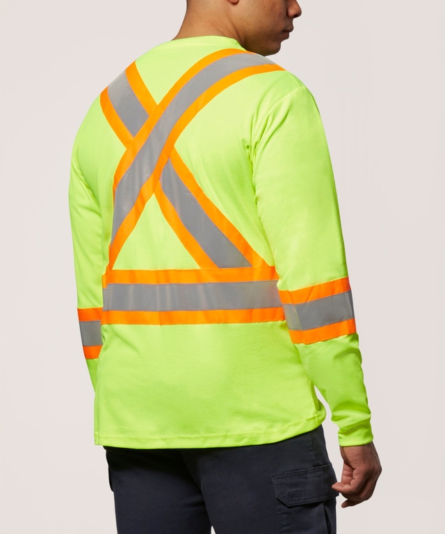 Ce t-shirt de travail haute visibilité à manches longues de Dakota convient parfaitement aux travailleurs qui œuvre sur les chantiers de construction extérieurs, aux camionneurs ainsi qu'au personnel d'entrepôt. Il est fabriqué en tissu double épaisseur et arbore un extérieur en polyester résistant grand teint de première qualité. En outre, il possède un intérieur en coton doux et perméable à l'air. Ce t-shirt de sécurité est conforme aux normes canadiennes applicables en matière de visibilité. Il affiche ainsi des bandes réfléchissantes au corps et sur les manches. Les rayures sur la poitrine comportent des endroits qui vous permettront d'accrocher un insigne d'identité, un téléphone cellulaire ou un appareil radio. Shane mesure 1,87 m (6 pi 1-1/2 po) et porte ce t-shirt de sécurité en taille Grand