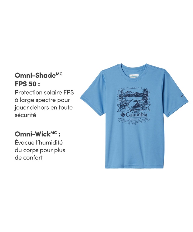 Ce t-shirt performance de Columbia est fabriqué en tissu extensible léger qui évacue l'humidité. Il offre aussi une protection FPS 50 contre les rayons nocifs du soleil afin de protéger la peau de votre enfant.