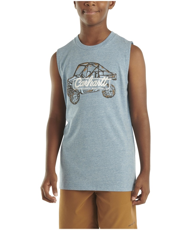 Ce t-shirt en jersey de coton d'épaisseur moyenne de Carhartt assure le confort des enfants. L'emblématique «C» de Carhartt sur le devant est agrémenté d'un véhicule tout-terrain. Il semble se diriger vers l'aventure où il peut faire face à tout ce que les enfants lui font subir.