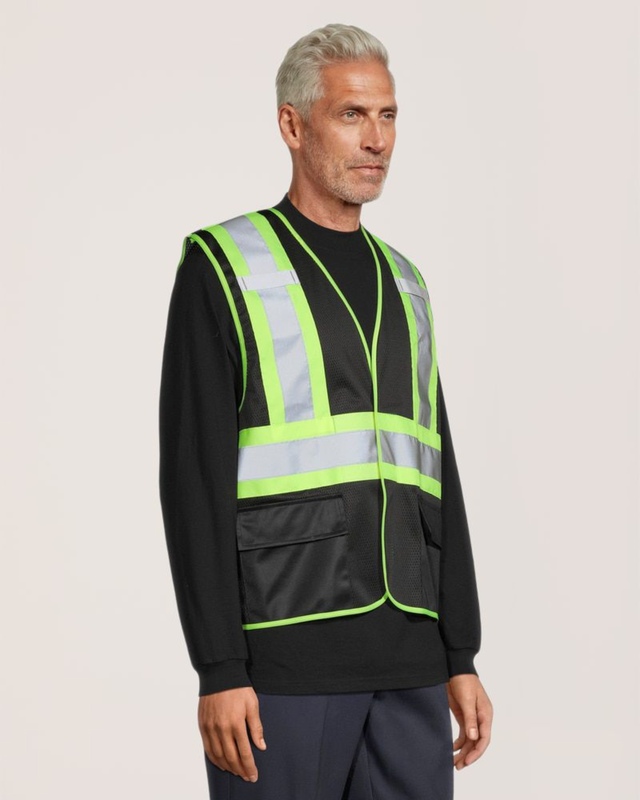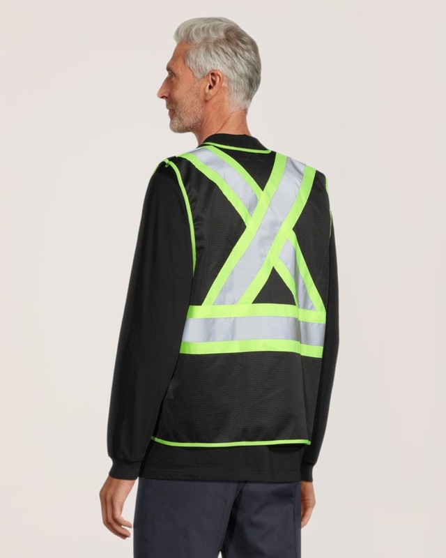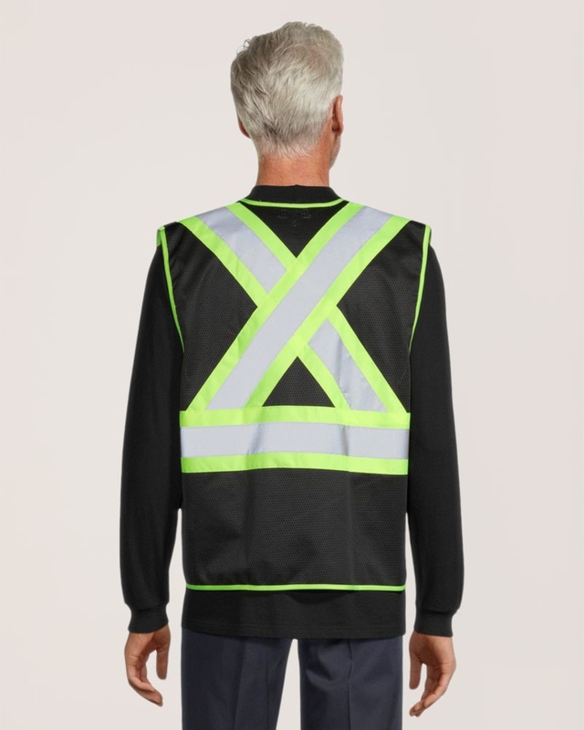 SÉCURITAIRE AVANT TOUT : CSA Z96:22 catégorie 1, niveau 2. ANSI/ISEA 107-2020 type O, catégorie 1. Matériau réfléchissant de 2 po (5 cm) en une configuration de 4 po (10 cm) répondant aux exigences des organismes CAT/WorkSafeBC/DOT Cette veste n'est pas ignifuge