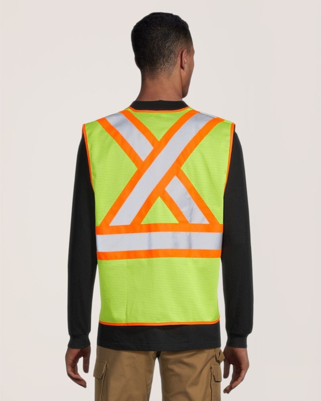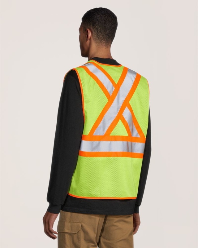 SÉCURITAIRE AVANT TOUT : CSA Z96:22 catégorie 2, niveau 2. ANSI/ISEA 107-2020 type R, catégorie 1. Matériau réfléchissant de 2 po (5 cm) en une configuration de 4 po (10 cm) répondant aux exigences des organismes CAT/WorkSafeBC/DOT Cette veste n'est pas ignifuge