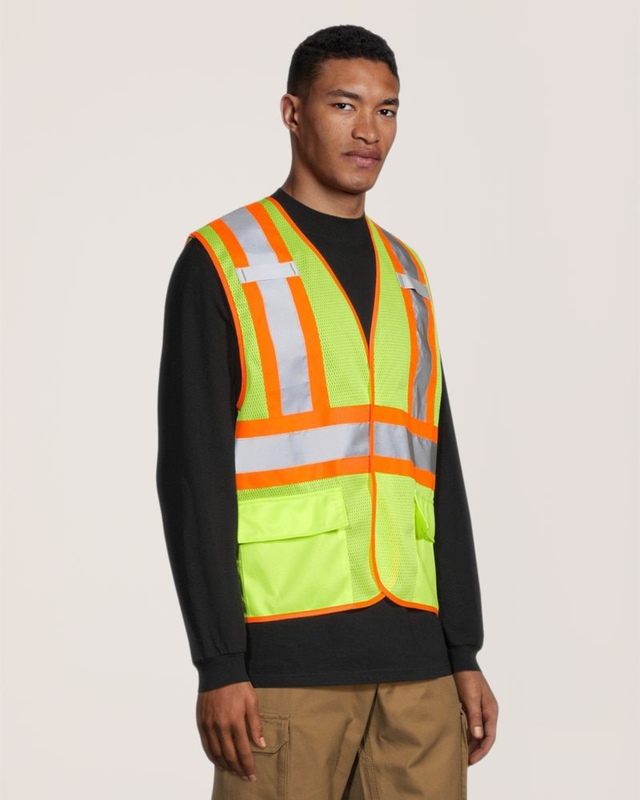Cette veste de sécurité à haute visibilité de catégorie 2 d'Aggressor répond aux normes de sécurité canadiennes appropriées en matière de visibilité. Elle est parfaite pour les travailleurs extérieurs sur les chantiers de construction. Elle à des poches avant spacieuses pour les petits accessoires et des boucles sur les épaules avant pour votre carte d'identité et votre téléphone.