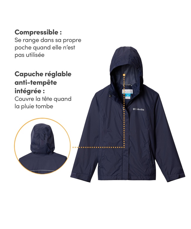 Cette veste Arcadia de Columbia pour filles est étanche à l’eau, perméable à l’air et compressible. Elle est faite pour la protéger de la pluie. Lorsqu’il fait plus sec, elle peut la ranger dans son sac. En plus de la membrane Omni-TechMC, la veste comporte des coutures entièrement scellées ainsi qu’une doublure douce en filet qui la gardera bien au sec en tout confort.