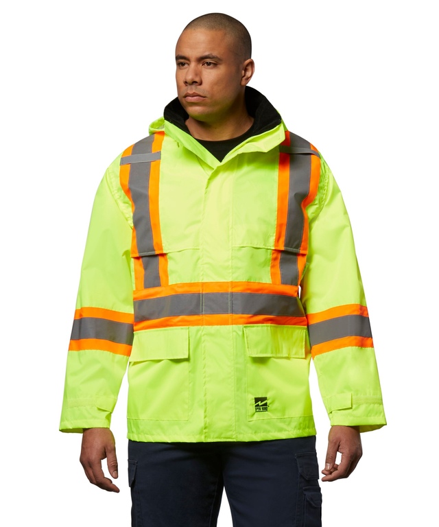 Cette veste de travail haute visibilité Open Road est étanche à l'eau et au vent. Le tissu reste souple même au froid. Elle est de fabrication résistante et assez ample pour aller par-dessus les vêtements de travail et offrir de l'aération. Cette veste a une capuche amovible et des poignets ajustables. Elle satisfait les normes de la CSA concernant la sécurité quand il fait sombre.