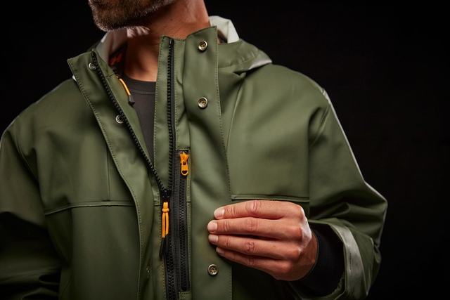 FERMETURE À GLISSIÈRE YKK PLEINE LONGUEUR SUR LE DEVANT SOUS UNE PATTE ANTI-TEMPÊTE DE TISSU DOUBLE