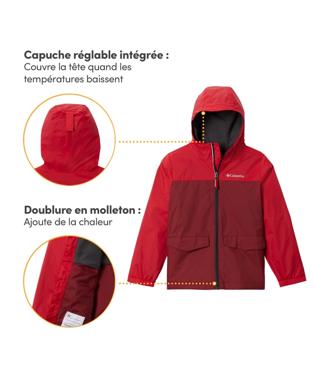 Cette veste imperméable de Columbia est idéale pour garder votre explorateur en herbe bien au sec et heureux. Elle est constituée d'un tissu étanche à l'eau et possède une capuche ajustable de même qu'une douce doublure en micromolleton.