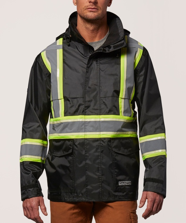 Notre veste de sécurité de Dakota est constituée d'un tissu étanche à l'eau indéchirable qui offre une résistance supérieure à la déchirure. Elle reste souple dans des conditions froides et mouillées. La veste a une doublure en filet au corps pour un confort perméable à l’air. En outre, sa capuche à visière en trois sections peut être détachée aisément lorsque la température le permet. Pour plus d'étanchéité, cette veste est pourvue d'une fermeture à glissière ultrarésistante entre les rabats anti-tempête intérieurs et extérieurs ainsi que de pattes de poignet ajustables. Entièrement conforme aux normes de sécurité portant sur la visibilité établies par les organismes WCB, WorkSafe, DOT, CSA et BC MOT, cette veste de travail à technologie double Vizlite™ offre plusieurs compartiments qui vous permettent de ranger le matériel que vous portez avec vous au travail. Tous les détails sont disponibles dans la boîte de texte complémentaire décrivant les attributs du produit.